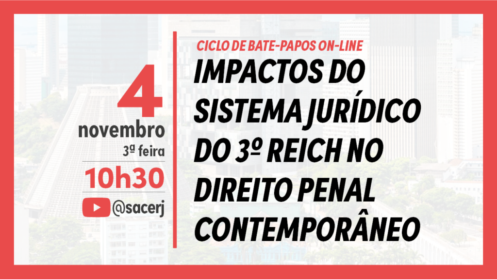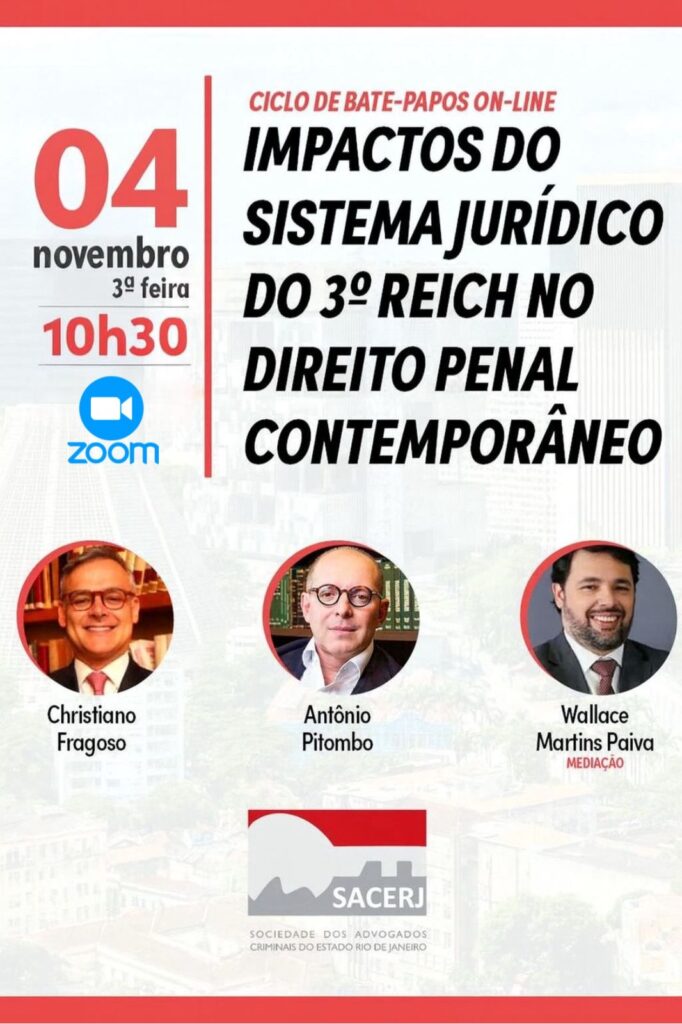 A Sociedade dos Advogados Criminalistas do Estado do Rio de Janeiro (SACERJ) realizou, no último dia 4 de novembro, o primeiro encontro do seu Ciclo de Bate-Papos Online, com o tema “Impactos do sistema jurídico do 3º Reich no Direito Penal contemporâneo”. O debate contou com a participação dos juristas Christiano Fragoso e Antônio Pitombo, […]